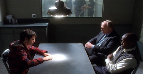 Will gets into a jam and is interrogated by the police. The detective on the far side of the table is played by director James Keach. Black ProMist filters were used along with several stops of overexposure to achieve the “blooming” look of the bright areas, while keeping the shadowy parts of the frame suitably dark.
